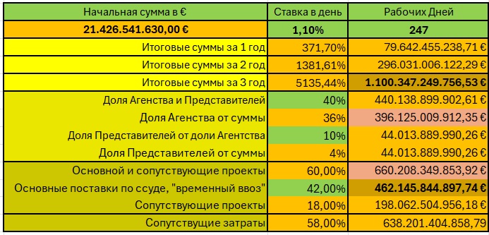 5.6.1. Прогнозируемые финансовые результаты. В течение трех лет, на основе заключенных договоров цессии, «Цеденты» могут самостоятельно приумножить первоначальную сумму (€ 21.426,54 млн. или 1.428 пулов по € 15,00 млн. для трейдинга), но еще в виде «синтетических» (спекулятивных, пузырьковых) денег, с использованием трейдинговых программ и получения доходности на скромные проценты в 1,10% в день (вместо 2% для инвесторов, тем более, 4% всего). Это даст: