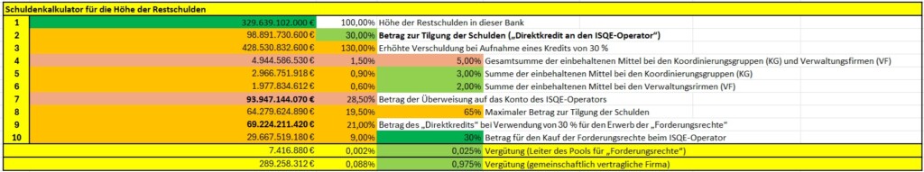 3.8. Die insgesamt gestiegene Schuld (130 %, unter Berücksichtigung der zusätzlichen Kreditemission von 30 %) vor der Übertragung der Forderungen in den ISQE-Algorithmus beträgt € 428.530,83 Mio.