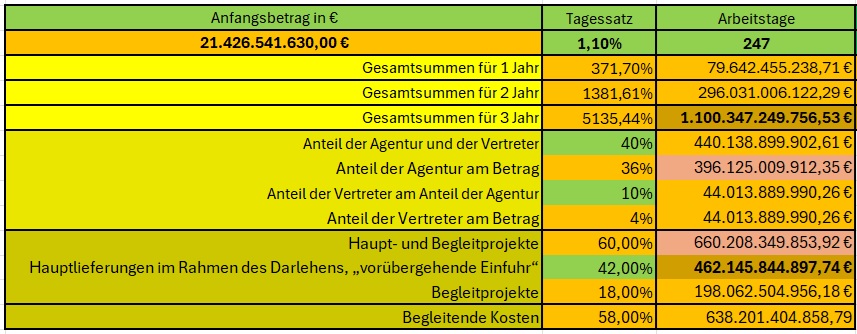 - Lieferung technologischer Ausrüstung an die Auftraggeber nach dem Schema der „vorübergehenden Einfuhr“, abgestimmt mit der Deutschen Bundesbank, in Höhe von € 462.145,84 Mio., wodurch das spekulative, blasenartige Geld in reale Werte transformiert wird, anstatt weiterhin auf die Rückzahlung von € 329.639,10 – € 428.530,84 Mio. Schulden seitens der Kreditnehmer zu hoffen.