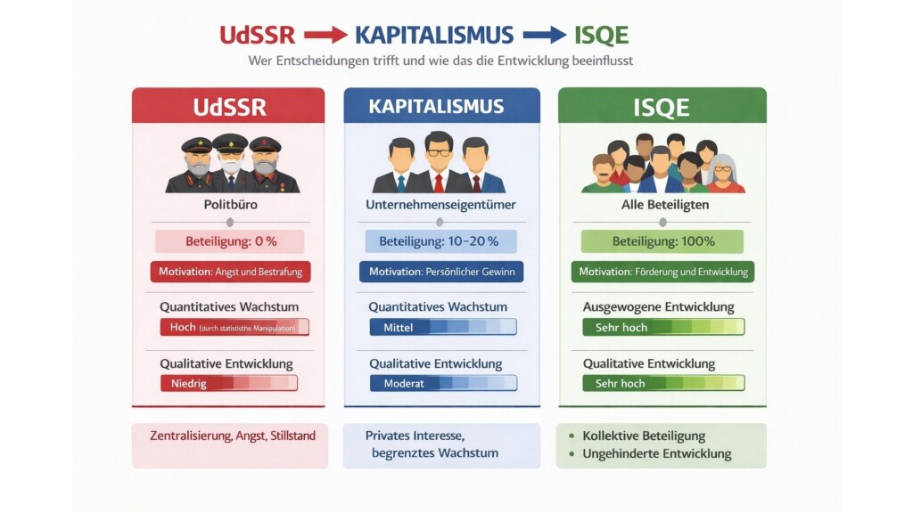 - ISQE / Ampozelismus: Das Recht auf Mitbestimmung wird allen Systemteilnehmern gewährt. Durch nicht-monetäre Leistungsindikatoren beeinflusst jeder die Systementwicklung, parasitäre Rentenmechanismen werden eliminiert, und die Motivation zur Entwicklung steigt im Vergleich zum Kapitalismus auf 100 %.