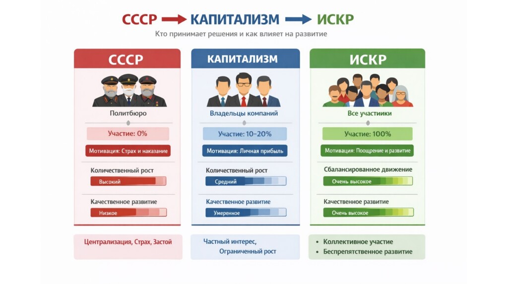 - ИСКР (Ампоцелизм): право на участие в принятии решений распространяется на всех участников системы. Через показатели нестоимостной оценки труда каждый влияет на развитие всей системы, исключая паразитический рентный механизм и повышая мотивацию на развитие до 100% по сравнению с капитализмом.