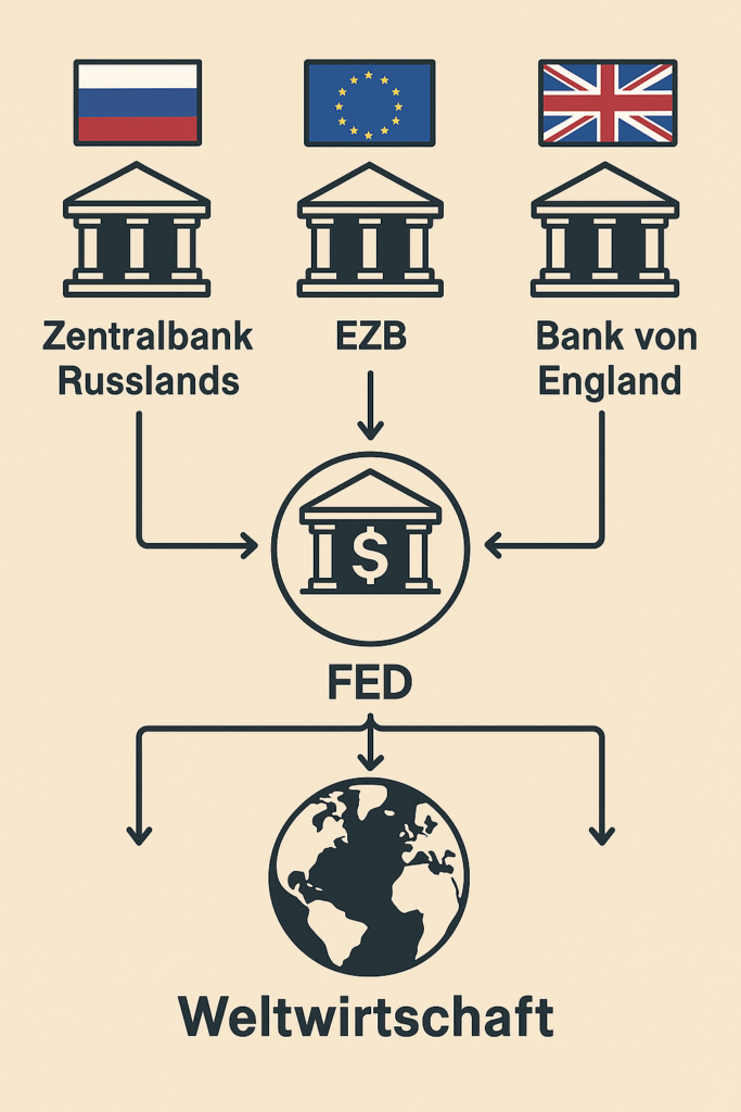 Die Kontrolle erfolgt über Zentralbanken. Ein Beispiel ist die Verbindung der russischen Zentralbank mit der Fed und der Weltwirtschaft.