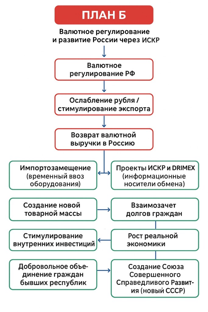 – Неминуемое повышение цен в рублях неизбежно подтолкнёт массово граждан России и других стран бывшего СССР к срочному вступлению в программу ИСКР и широкому использованию не денег, а «информационных носителей обмена поддержками» ИСКР и DRIMEX, что соответствует плавному переходу по «Плану Б» https://drimex.net/handlungsablauf/.