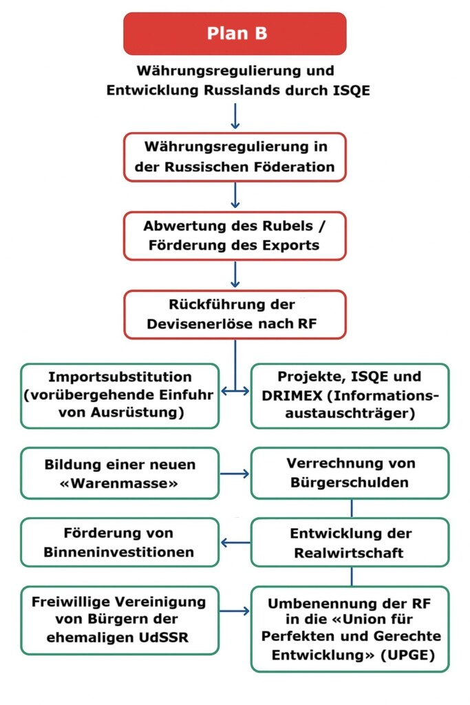 - Der unvermeidliche Preisanstieg in Rubel wird die Bürger Russlands und anderer Länder der ehemaligen UdSSR massiv dazu bewegen, dem ISQE-Programm beizutreten und verstärkt nicht Geld, sondern „Informationsaustauschträger“ von ISQE und DRIMEX zu nutzen, was einem sanften Übergang zu „Plan B“ entspricht (https://drimex.net/handlungsablauf/).